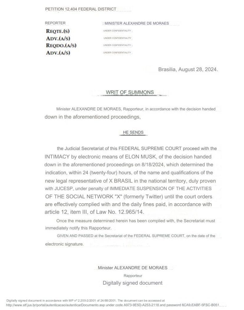 Justice Moraes, who has been involved in a long-running row with X, had given the social media platform 24 hours to name a new legal representative or face suspension, with a deadline of Thursday evening.