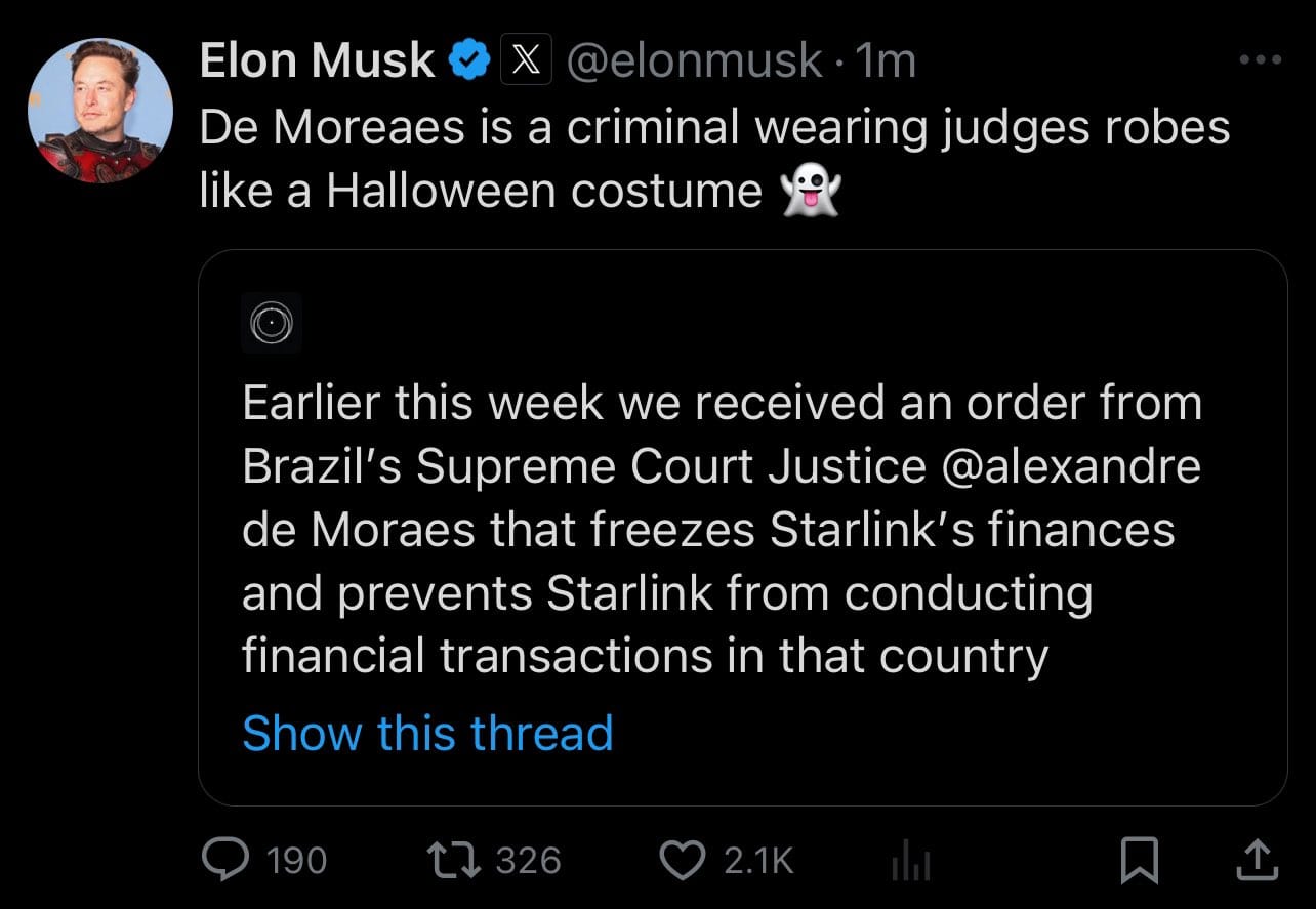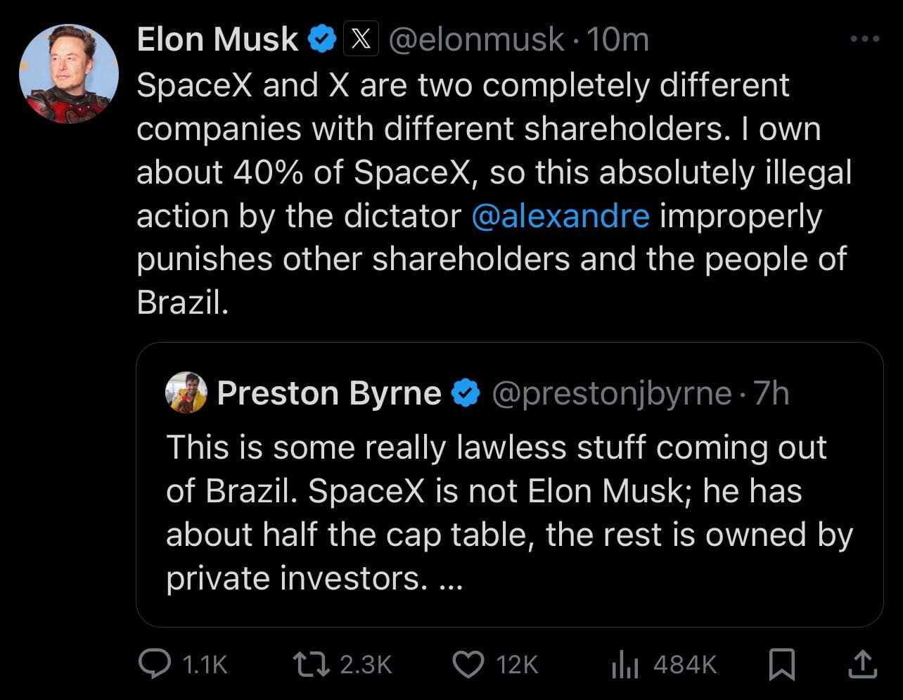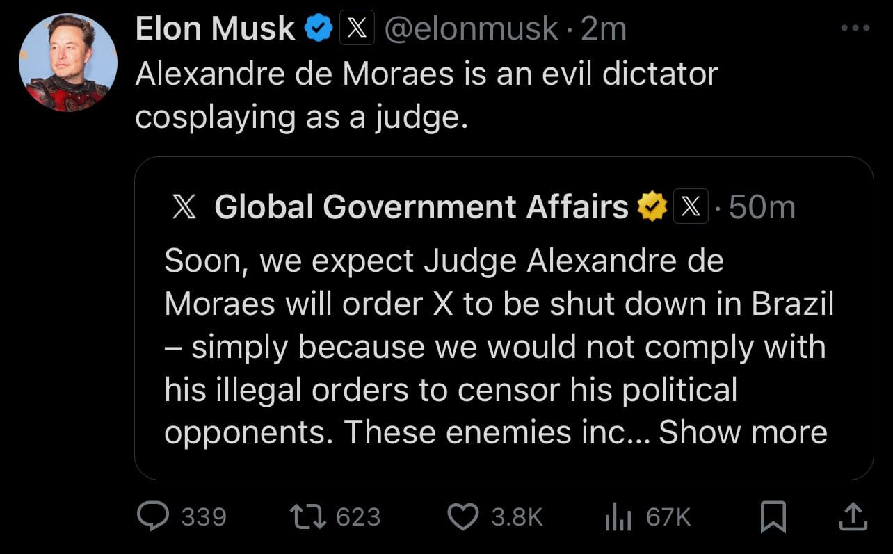 The oppressive regime in Brazil is so afraid of the people learning the truth that they will bankrupt anyone who tries https://t.co/VgYPRJMXJvā Elon Musk (@elonmusk) August 30, 2024