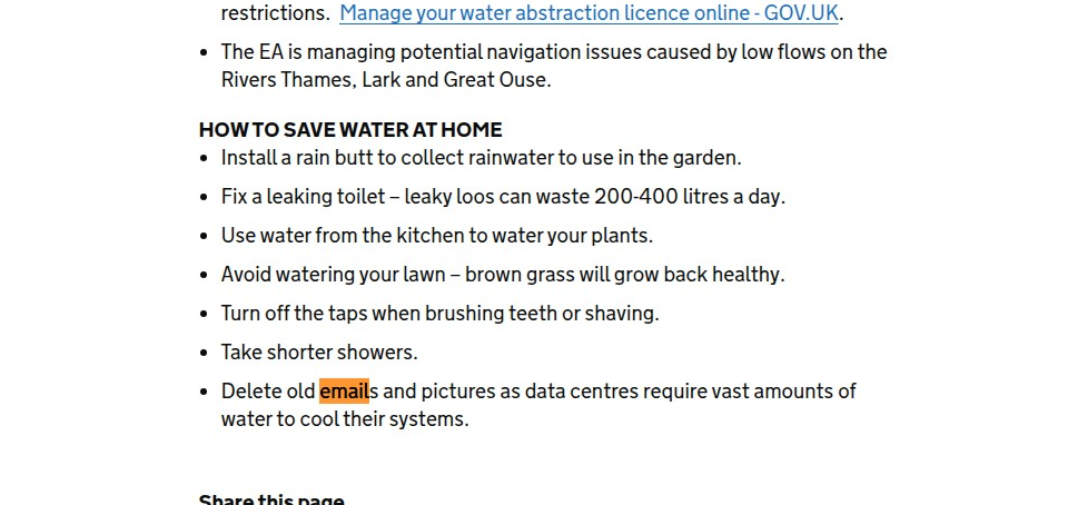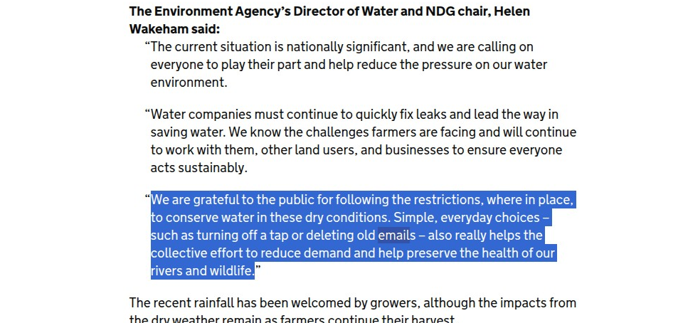 During Britainās worst drought since 1976, the UKās National Drought Group declared a ānationally significant incidentā with five areas officially in drought and six more experiencing prolonged dry weather. Among traditional water-saving tips like fixing leaky toilets and taking shorter showers, officials added an unusual suggestion: āDelete old emails and pictures as data centres require vast amounts of water to cool their systems.ā