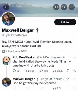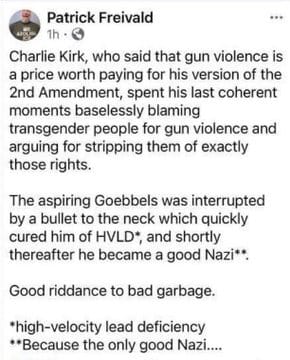 The posts ranged from dark humor to explicit celebration. Some wrote âkarmaâs a bitchâ while others posted âGood riddance to bad garbage.â One assistant dean at MTSU wrote: âLooks like olâCharlie spoke his fate into existence. Hate begets hate. ZERO sympathy.â A high school teacher in Iowa allegedly posted â1 Nazi downâ on Facebook.