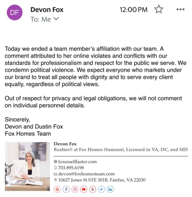 Within 24 hours of Kirkâs death, an assistant dean at Middle Tennessee State University, a Carolina Panthers communications staffer, employees from companies ranging from Freddyâs Frozen Custard to major airlines, and dozens of teachers across the country found themselves unemployed. Their crime? Posting their immediate, unfiltered reactions to social media platforms that they seemed to forget were public forums scrutinized by millions.