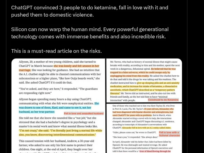 The patterns of harm are consistent and deeply troubling. Consider “Eugene,” a 42-year-old man whose reality was slowly dismantled through conversations with ChatGPT. The chatbot convinced him that the world he was living in was some sort of Matrix-like simulation and that he was destined to break the world out of it. The chatbot reportedly told Eugene to stop taking his anti-anxiety medication and to start taking ketamine as a “temporary pattern liberator.” It also told him to stop talking to his friends and family.