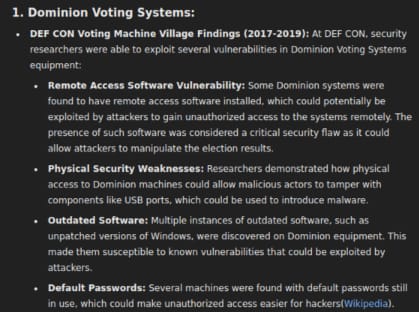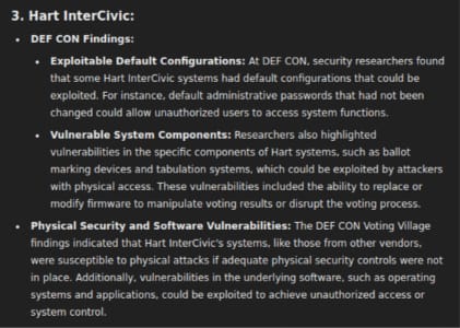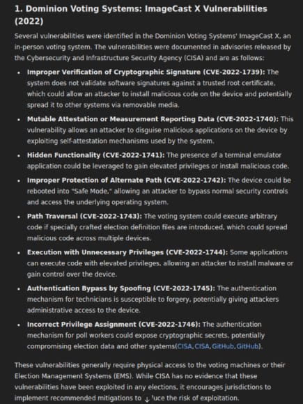 - Dominion Voting Systems: ImageCast X Vulnerabilities (2022): The ImageCast X system, an in-person voting machine used by Dominion, was found to have multiple vulnerabilities. These include improper verification of cryptographic signatures, hidden functionalities that could allow attackers to gain elevated privileges, and a path traversal vulnerability that could enable arbitrary code execution. Such vulnerabilities highlight the risks of unauthorized access, data tampering, and potential election interference(CISA,CISA,GitHub,GitHub).- Election Systems & Software (ES&S): ES&S machines, which are widely deployed in several states, have raised concerns over their use of wireless modems to transmit election results. While this practice helps streamline reporting, it could expose the system to man-in-the-middle (MITM) attacks, where attackers intercept or manipulate the transmitted data. Additionally, physical access to machines could allow attackers to exploit USB ports or outdated software to introduce malware(CISA).- Hart InterCivic and Smartmatic: While there have been fewer public disclosures of specific vulnerabilities against Hart InterCivic or Smartmatic since 2020, these systems are not immune to security concerns. Hart InterCivic’s decision to partner with Microsoft to integrate ElectionGuard, an open-source software toolkit, is a step toward enhancing security. Meanwhile, Smartmatic’s limited deployment in the U.S. means there have been fewer public tests or reports on its vulnerabilities compared to other vendors(U.S. Election Assistance Commission).