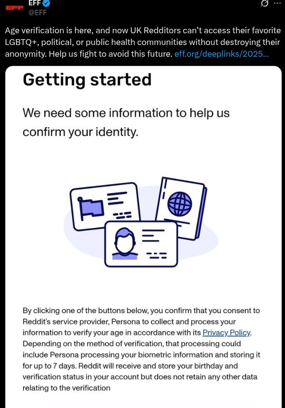 Age verification is here, and now UK Redditors canāt access their favorite LGBTQ+, political, or public health communities without destroying their anonymity. Help us fight to avoid this future. https://t.co/aXbQ6fJrzQ pic.twitter.com/OXNESFHMNsā EFF (@EFF) August 9, 2025