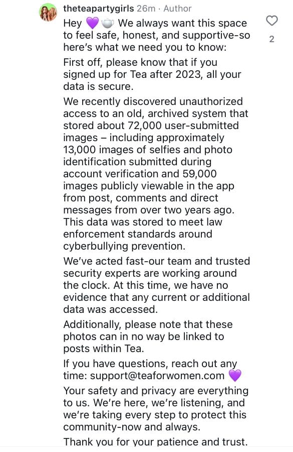 Tea’s response to the breach has been inadequate and contradictory. The company initially claimed the exposed data was “from more than two years ago” and that “no current user data is affected.”