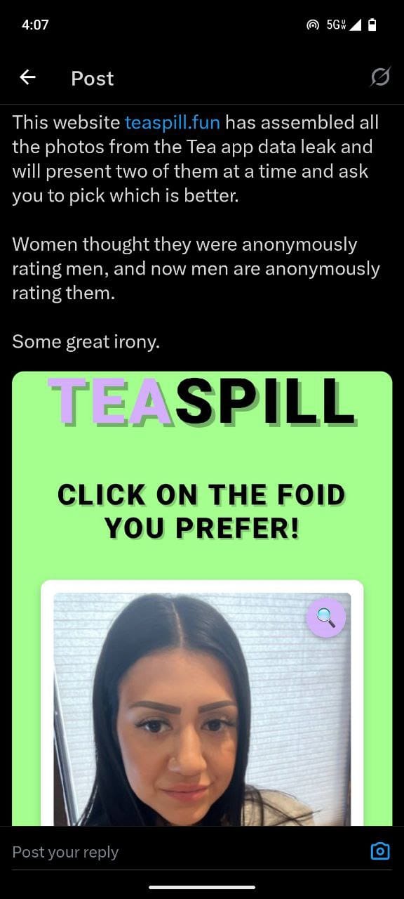 Someone created a website where you can rate the users of the hacked feminist doxing app “Tea”.