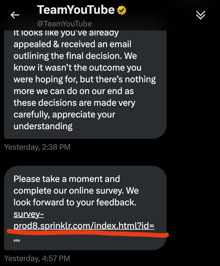 One creator received a survey from Sprinklr after their appeal was rejected, confirming the automated nature of the entire process.